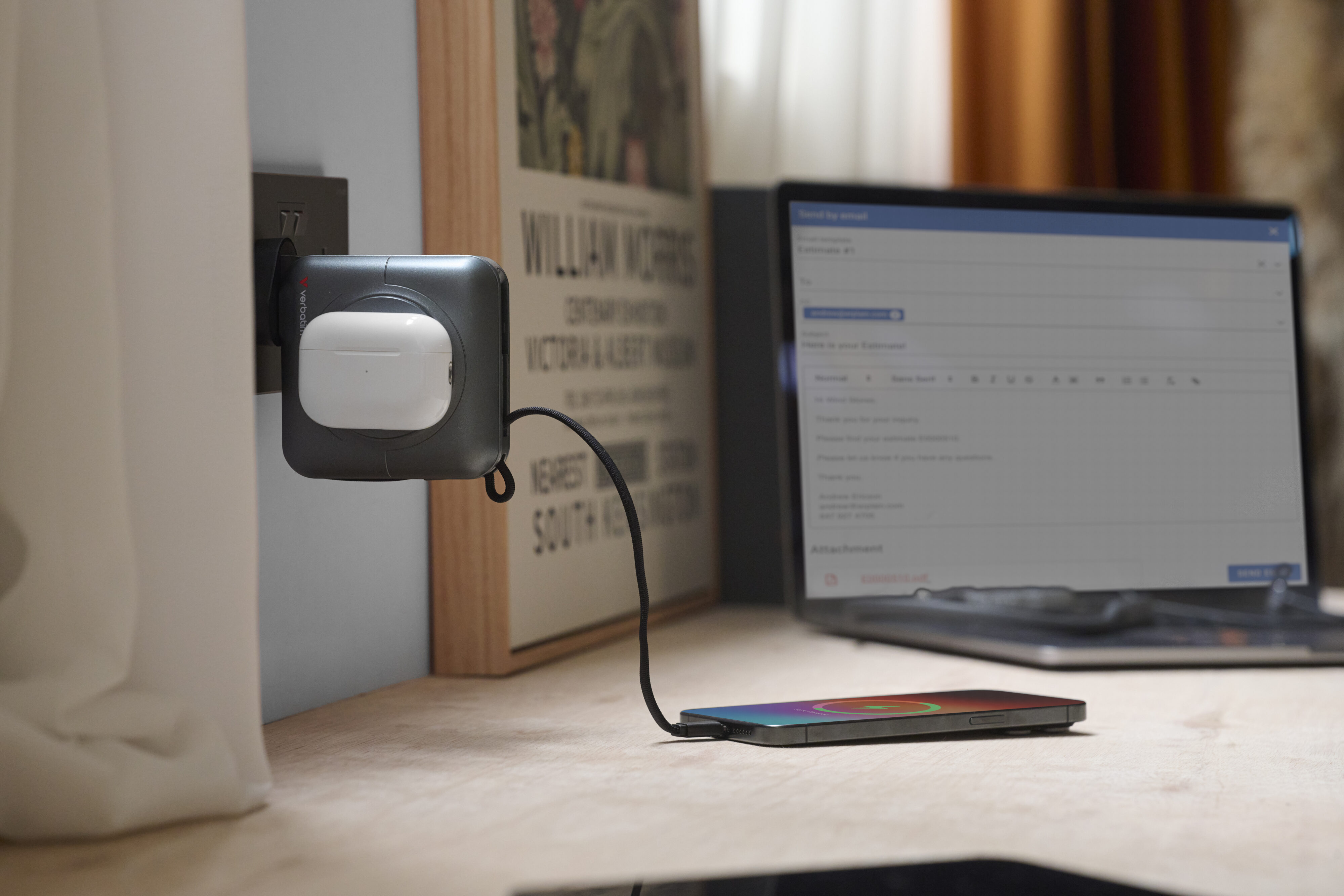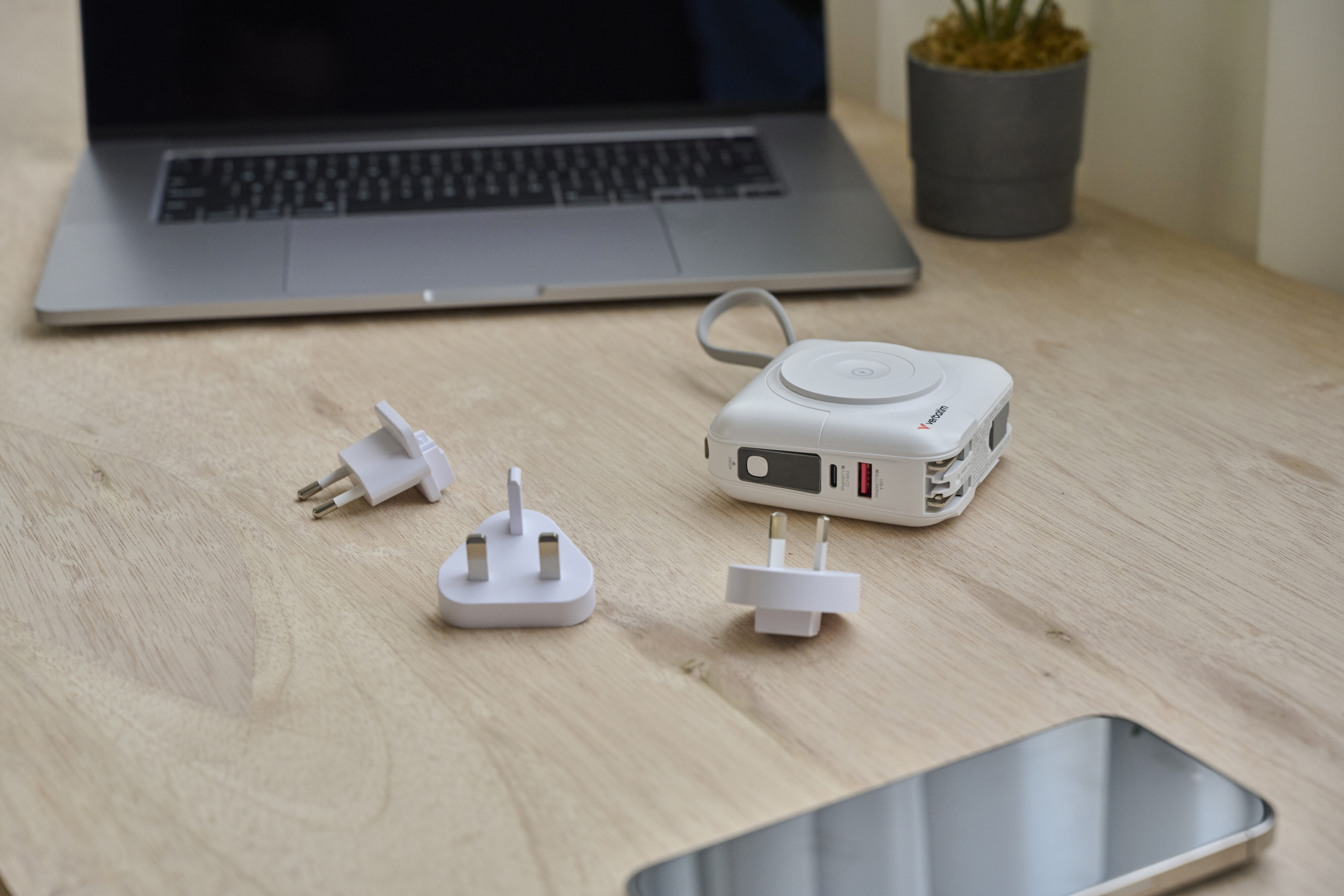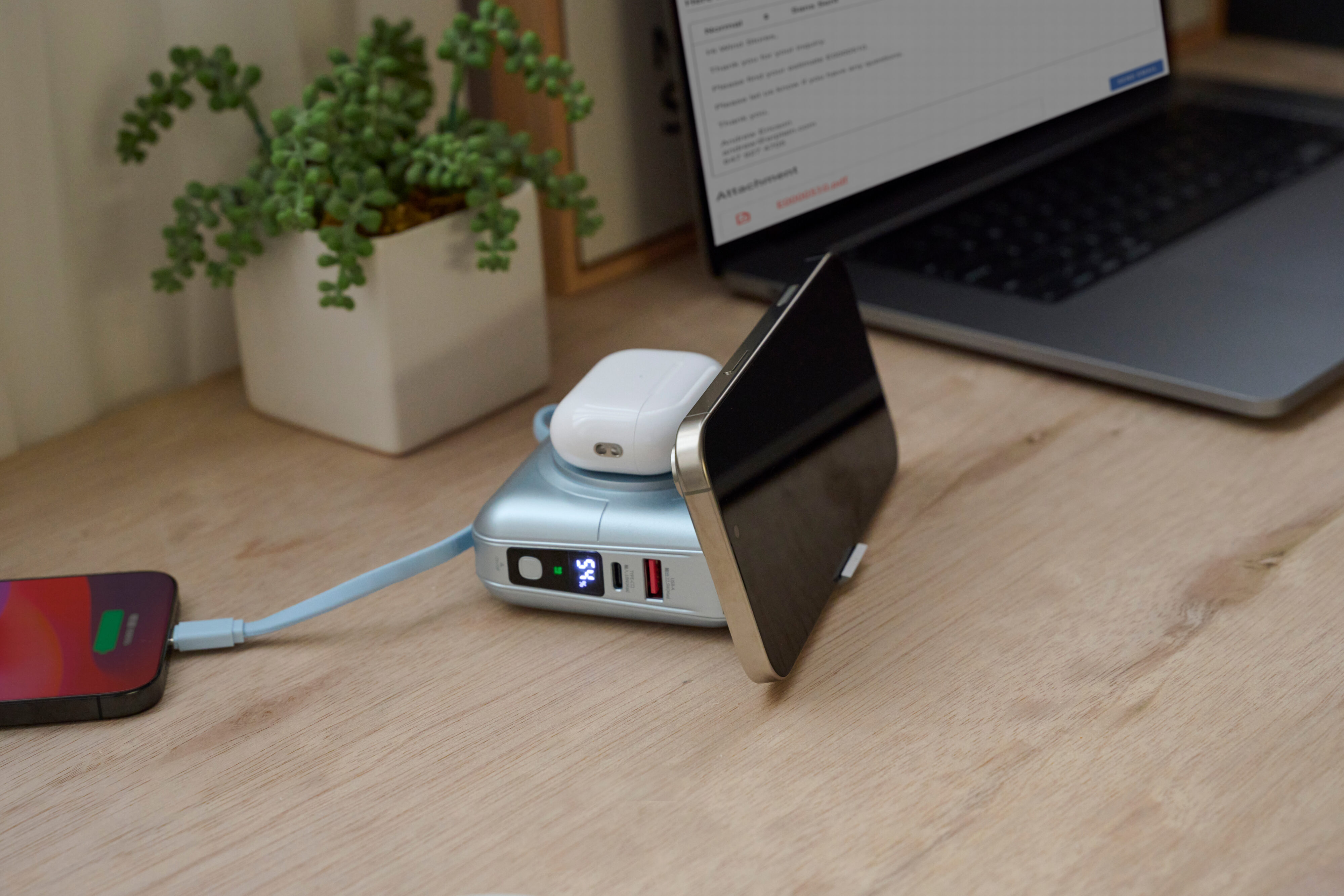 This versatile power bank integrates magnetic wireless charging (15W) with dedicated outputs for smartphones (15W)*, smartwatches (2.5W), and earbuds (5W). It also supports up to 45W PD wired fast charging, making it suitable even for laptops and high-consumption devices. With a foldable AC plug and 3 interchangeable international plugs, you can plug directly into wall outlets for instant charging—ideal for business trips and travel.