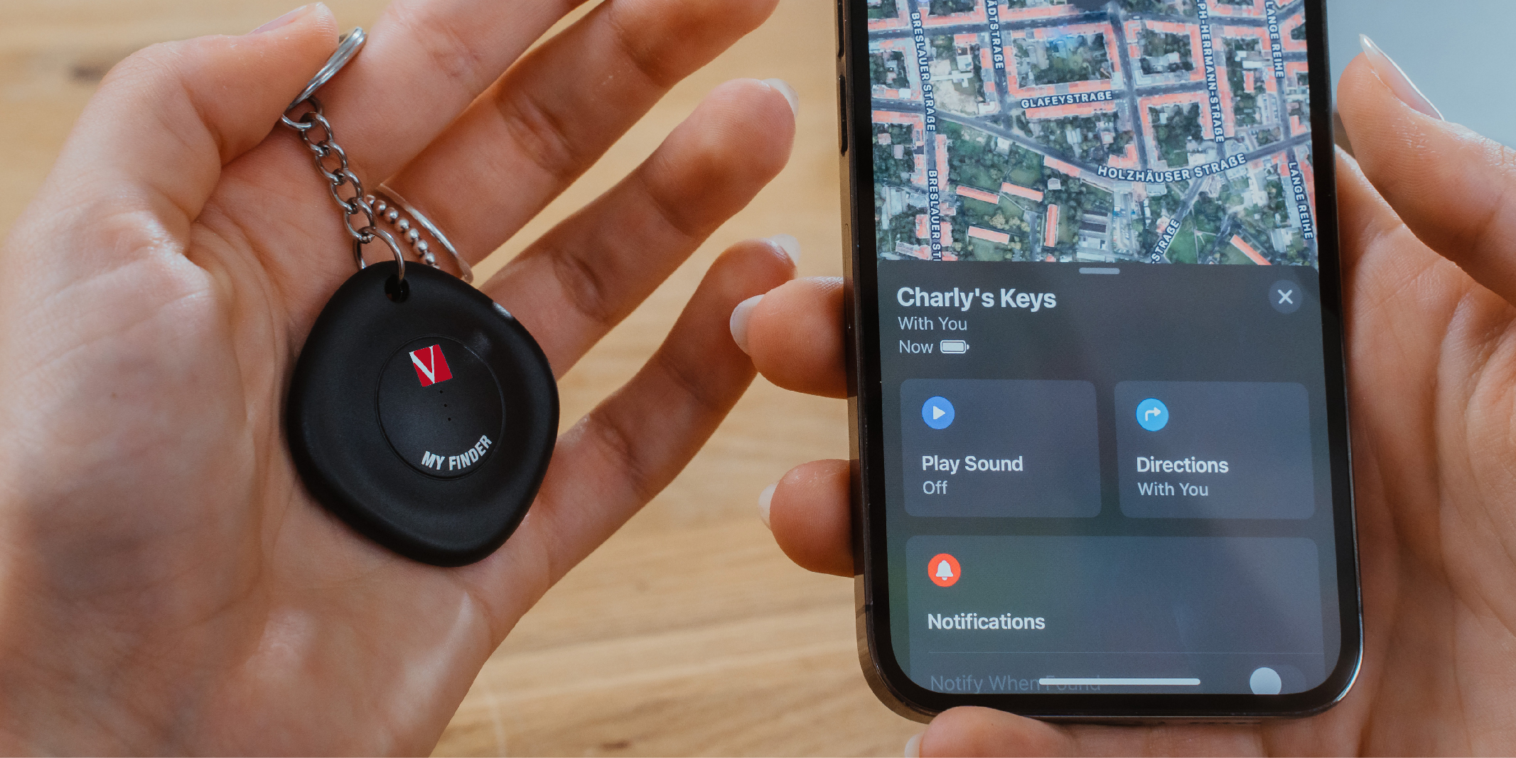 To see your items on the map, you just have to open the Find My App and its location will display on map immediately. My Finder is building in「Lost Mode」and「Notify When Left Behind」function, which can automatically get a notification. My Finder sends out a secure Bluetooth signal that can be detected by nearby iPhone, iPad and Macbook Find My network. These devices send the location of your My Finder, and then you can go to the Find My app and see it on a map. There is no geographic and network restrictions.