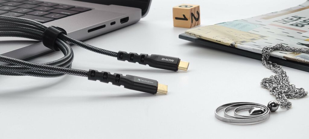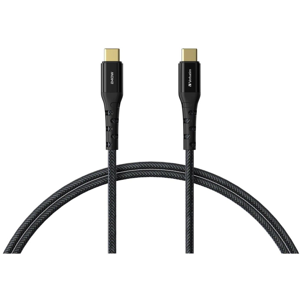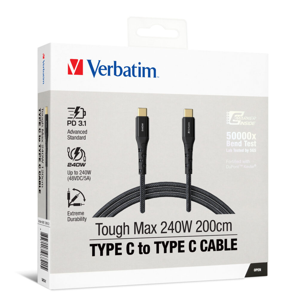 The Verbatim Tough Max 240W USB-C to USB-C Cable is engineered for high-speed charging and ultra-durable performance. Designed with Kevlar® fiber reinforcement, this cable withstands heavy use while delivering blazing-fast 240W power output, making it perfect for charging laptops, tablets, smartphones, and gaming devices with USB-C connectivity.